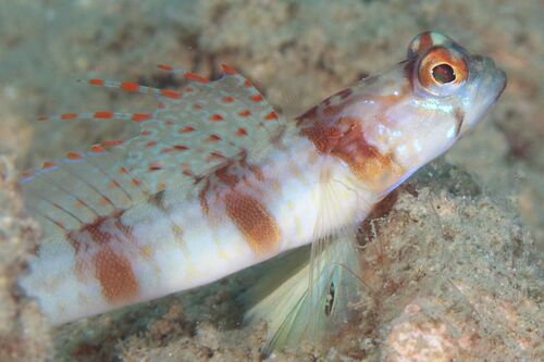 撮影日時:2001-05-03 撮影場所:バリ島トランバン(沈船) 撮影器材:Nikon F4 + 100マクロ x 2倍テレコン 南西諸島から南方のサンゴ礁域では、ダテハゼ属の中では、最もよく見かける種である。 小石やがれ場などの、比較的水の綺麗な場所に多く棲み、泥地に…