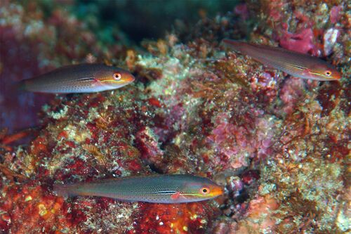 和名:ウツボ(ウツボ科) 学名:Gymnothorax kidako (Temminck et Schlegel, 1847) 英名:Kidako moray 分布:茨城~朝鮮・済州島 和名:ホンソメワケベラ(ベラ科) 学名:Labroides dimidiatus (Valenciennes, 1839) 英名:Bluestreak cleaner wrasse 分…