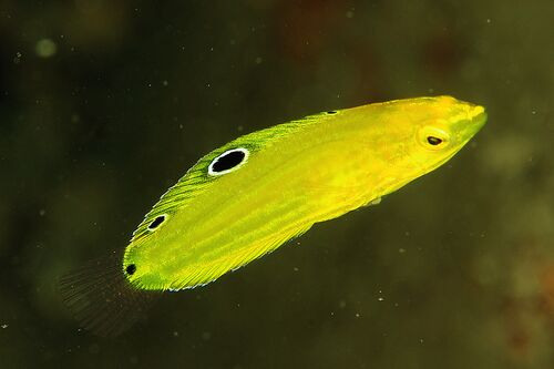 【種情報(標準和名・学名・英名等)】 標準和名:コガネキュウセン 和名の意味:黄金色のキュウセン 分類学的情報:ベラ科-ホンベラ属 分布:千葉~西部太平洋 学名:Halichoeres chrysus Randall, 1981 学名の意味:「ベラ」 + 「黄金色の」 英名:Canary…