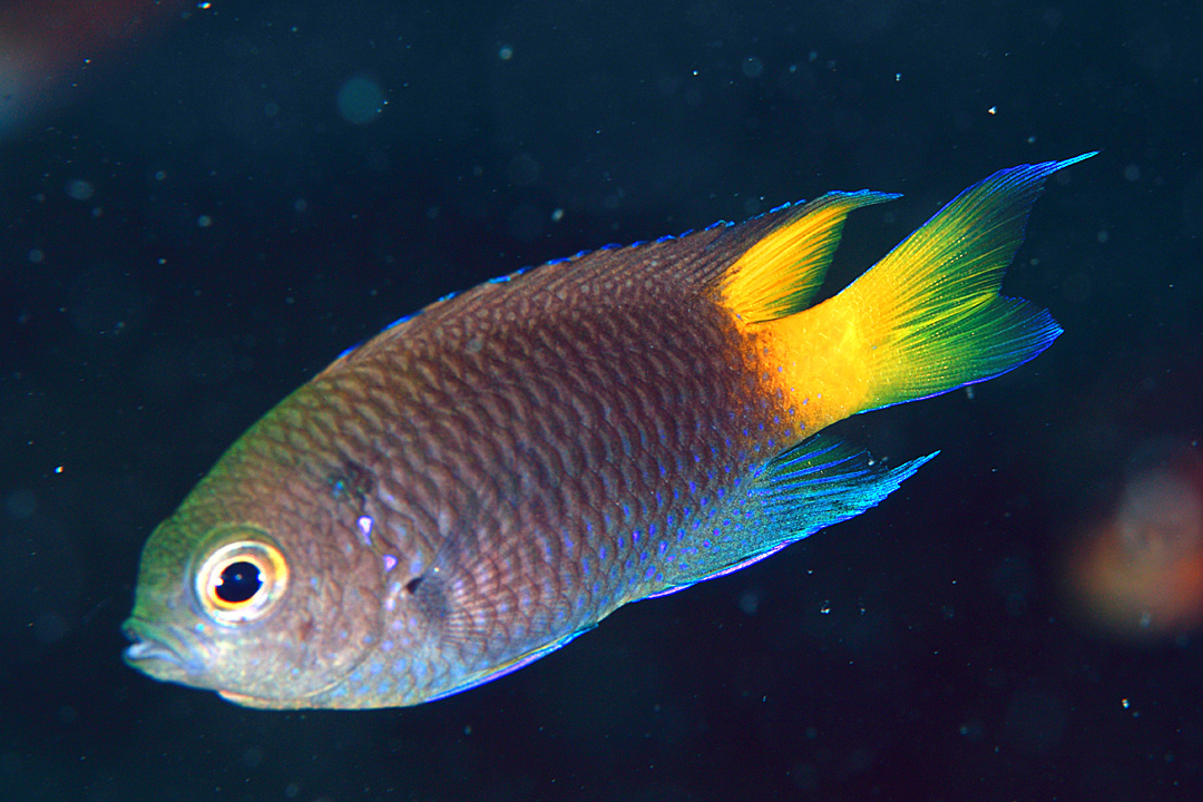 ところで、和名のスミレや、英名のViolet、学名のviolascenは、いずれも紫色を表わす言葉ですが、本種は体が紺色で、背びれ後端と尾びれが黄色をしており、なぜこのような名前になったのかは、よくわかりません。