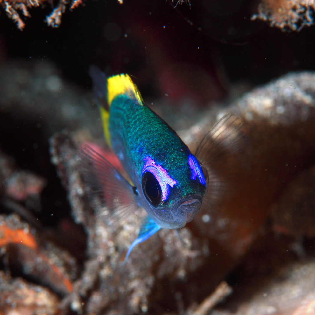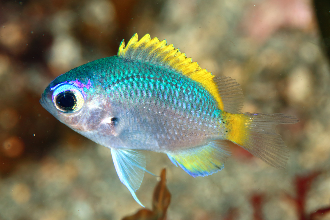 また、スズメダイの仲間では唯一、紫外線ライトを当てると体が蛍光発色することが、知られているそうです。