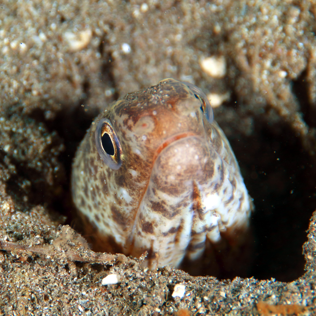 泥の中から、首だけを出している、比較的小型のウツボです。