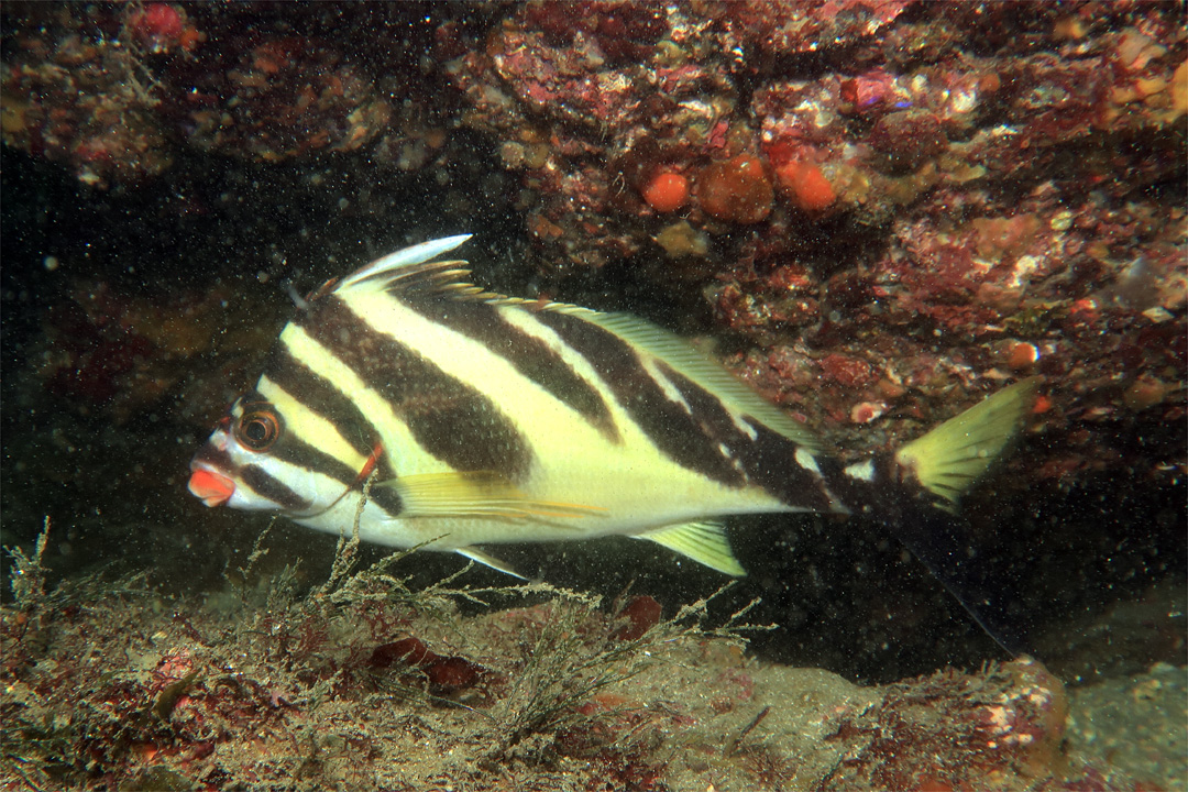 同じ科のタカノハダイに比べると、少し人を恐れる傾向があって、あまり接近した写真は撮りづらかったのですが、このときは、崖と私の間に入って動かずにいてくれました。