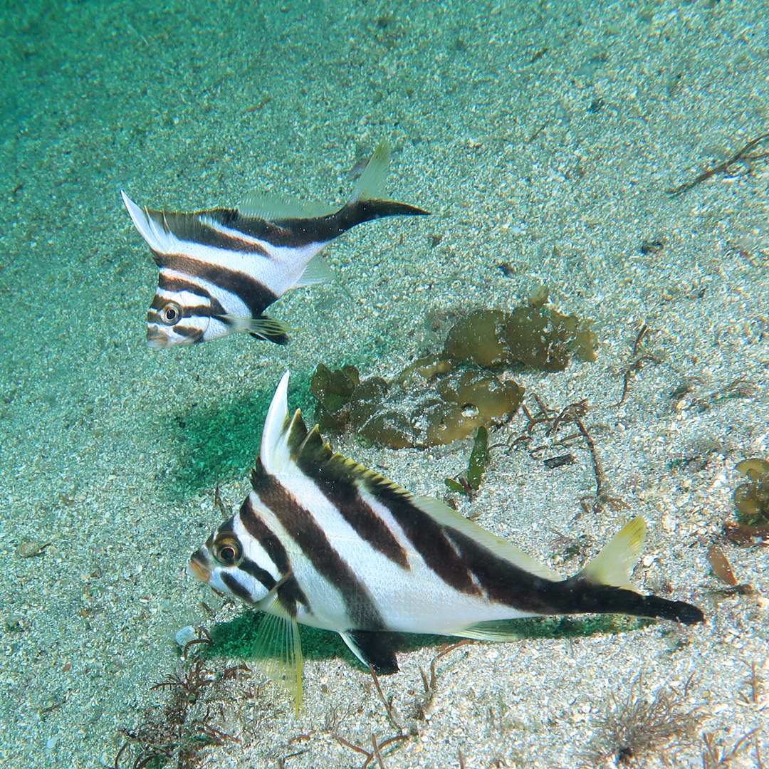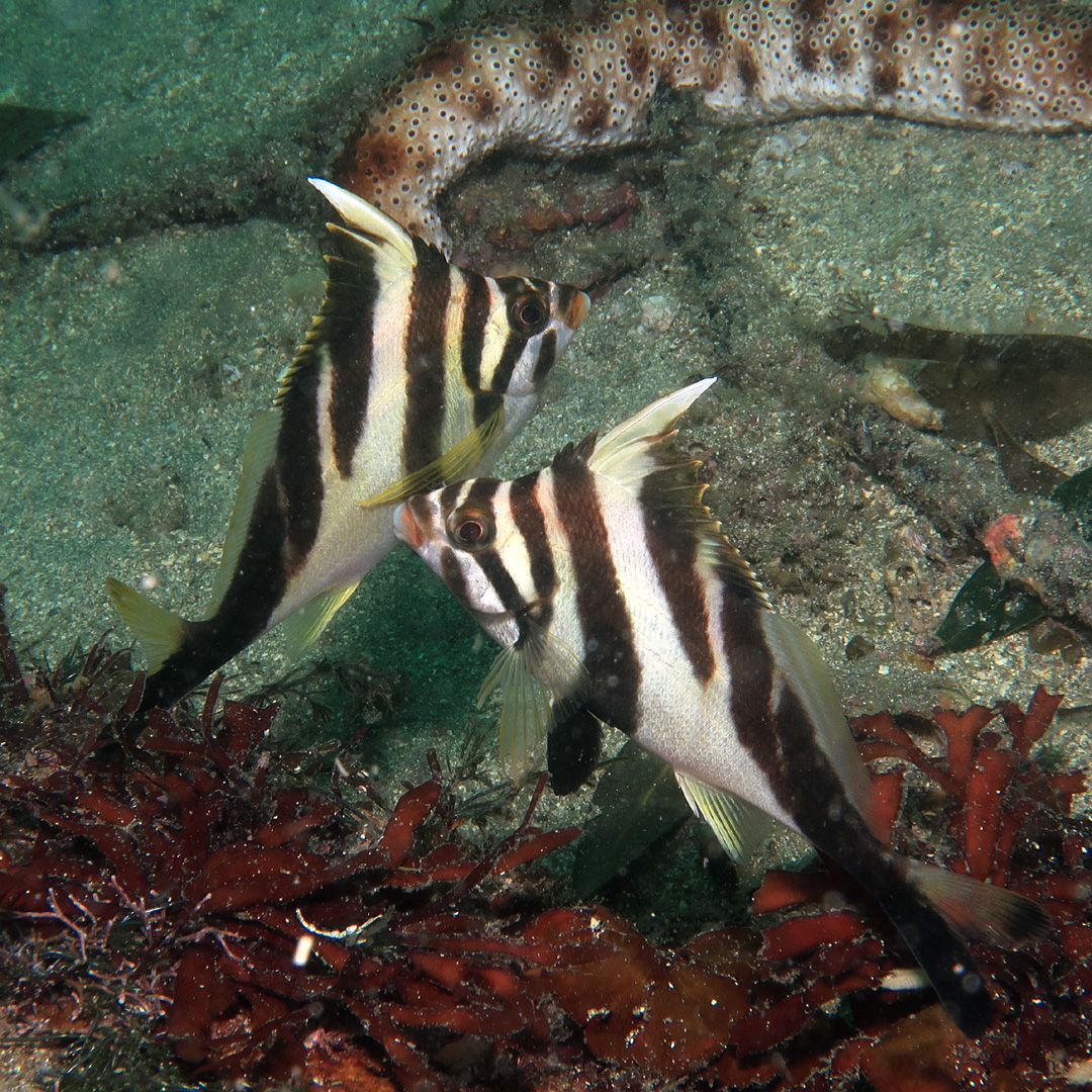下の写真は、成魚よりも少し若いステージのもので、2匹で魚礁の下から動かずにいました。